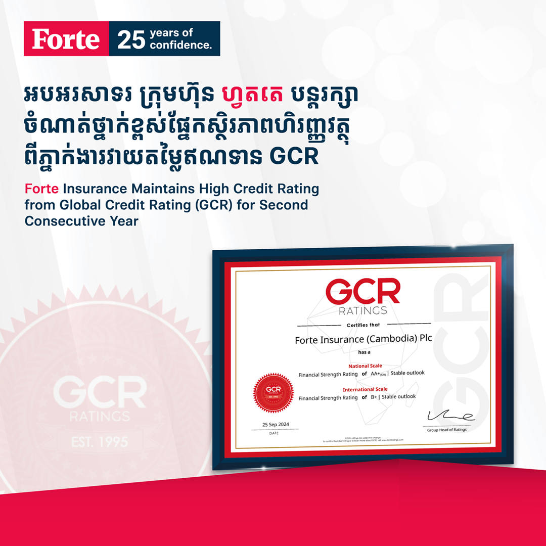 Mr. Suy Channtharong, Chief Executive Officer of Forte Insurance (Cambodia) Plc., expressed pride in this achievement: “As the nation’s oldest and most reputable domestic insurance company, receiving this affirmation from GCR once again is a testament to our financial resilience. Despite the global financial impact affecting various sectors, this rating shows Forte’s adaptability and strength in managing financial operations. We believe this further enhances the trust and confidence that customers and the public have in Forte’s brand.”