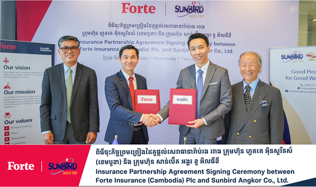 We are excited to announce the insurance partnership signing ceremony between Forte and Sunbird Angkor Co., Ltd. The ceremony took place on Wednesday 7 February, in the presence of Mr Suy Channtharong, Chief Executive Officer of Forte Insurance (Cambodia), Mr Kim Dongju, General Manager of Sunbird Angkor Co., Ltd. and the management teams of both companies.