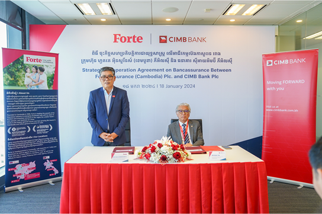 We are excited to announce the official signing of a Strategic Cooperation Agreement between Forte and CIMB Bank Plc on Bancassurance. This momentous event took place on Thursday 18 January, with the esteemed presence of Mr Youk Chamroeunrith, Chairman of the Board of Directors of Forte Insurance (Cambodia) Plc, Mr Bun Yin, Chief Executive Officer of CIMB Bank Plc, and the management teams of both companies.