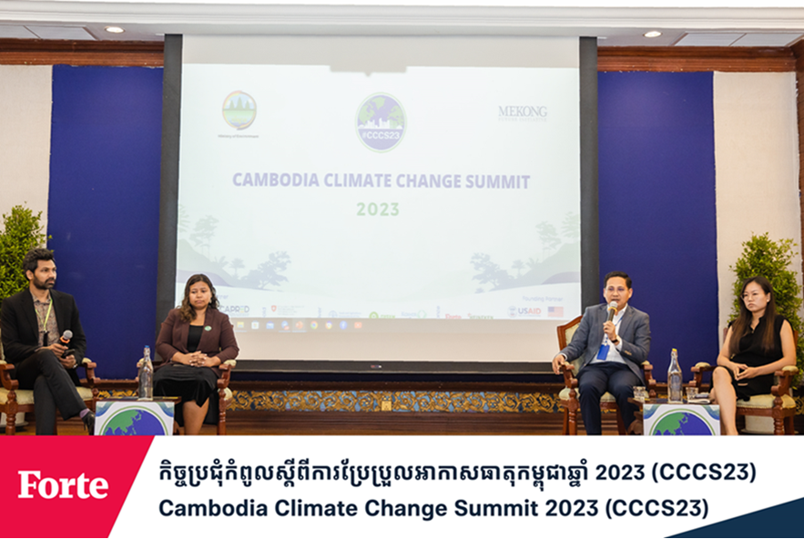 Forte, one of the largest and oldest insurance companies in Cambodia, is deeply committed to sustainability. This year, Mr Ny Lyhoung, Business Unit Head of Micro and Agriculture insurance, participated in the Cambodia Climate Change Summit 2023 (CCCS23), co-organized by the Ministry of Environment (MOE) and the Mekong Future Initiative (MFI).