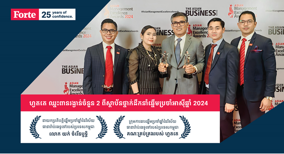 ក្នុងនាមជាប្រធានអគ្គនាយកប្រតិបត្តិនៃ ហ្វតតេ គ្រុប លោក យក់ ចំរើនឫទ្ធិ ត្រូវបានទទួលស្គាល់ជា “នាយកប្រតិបត្តិឆ្នើមប្រចាំឆ្នាំ នៃវិស័យធានារ៉ាប់រងទូទៅរបស់ប្រទេសកម្ពុជា” ដែលកិត្តិនាមនេះ ជាសក្ខីភាពសបញ្ជាក់ពីភាពជាអ្នកដឹកនាំដ៏ឆ្នើម និងការលះបង់របស់លោកចំពោះវិស័យធានារ៉ាប់រង។ នេះជាលើកទីមួយហើយ ដែលថ្នាក់ដឹកនាំផ្នែកធុរកិច្ច កម្ពុជា ទទួលបានកិត្តិយស និងការទទួលស្គាល់លំដាប់អន្តរជាតិ តាមរយៈ កម្មវិធី Asian Management Excellence Awards 2024។ ជាមួយនឹងបទពិសោធន៍ជាង 30 ឆ្នាំ ក្នុងវិស័យធានារ៉ាប់រង និងការគ្រប់គ្រងហានិភ័យ លោក ចំរើនឫទ្ធិ dedication to innovation and customer centricity has been key to keeping Forte at the forefront of the insurance industry.
