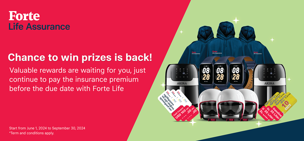 Valuable rewards are waiting for you, just continue to pay the insurance premium before the due date with Forte Life. The easiest way, as long as you continue to pay the insurance premium before the due date from June 1, 2024 to September 30, 2024, you can have a chance to win a lot of prizes. Take a protection with good fortune and live with confidence.