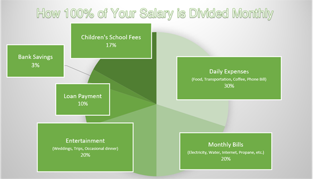 For an average office worker with children and a house and/or car loan, your monthly expenses would look something like this: