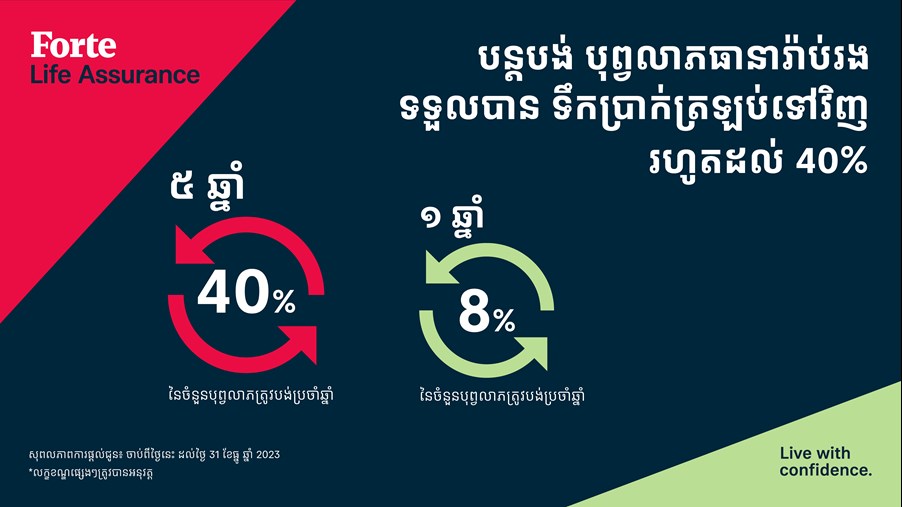 ចាប់ពីថ្ងៃនេះ រហូតដល់ថ្ងៃទី៣១ ខែធ្នូ ឆ្នាំ២០២៣, អតិថិជននឹងទទួលបានសាច់ប្រាក់ត្រឡប់មកវិញ រហូតដល់ ៤០% ដោយគ្រាន់តែធ្វើការបន្តបង់បុព្វលាភធានារ៉ាប់រងប្រចាំឆ្នាំរបស់លោកអ្នក។
