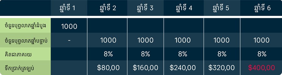 - សាច់ប្រាក់ត្រឡប់មកវិញ រហូតដល់ 8% លើបុព្វលាភដែលបានបន្តបង់ចាប់ពីឆ្នាំទី 2 តទៅ។